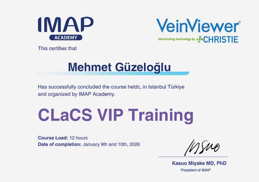 Doç. Dr. Mehmet Güzeloğlu, IMAP Academy tarafından İstanbul’da düzenlenen ve CLaCS yöntemine özel olarak yapılandırılan 12 saatlik CLaCS VIP Training programını başarıyla tamamlamıştır. Bu sertifika, tescilli CLaCS tekniğinin lazer ve skleroterapiyi bir arada kullanan özgün protokolü konusunda hem teorik hem de pratik düzeyde yetkinlik ve yetkilendirme aldığını gösterir.